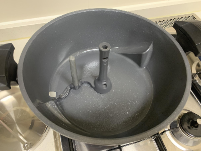 냄비 부분에는 가운데 회전장치를 넣고, 그 위에 음식물을 넣으면 됩니다. 램프쿡 자동 회전 냄비의 특별한 점은 다른 냄비와 다르게 기름배출구가 있다는 것입니다.