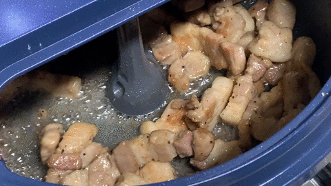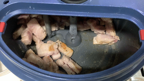 그래서 초반에 어느 정도 기름으로 조리를 하다가, 어느 정도 익으면 기름 배출구를 열어줘야 하는 컨트롤이 필요합니다. 그러니 결국에는 가스레인지 주변을 완전히 벗어날 수가 없는 것이죠.