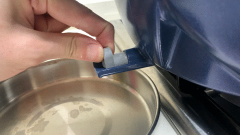 5. 겉면이 바삭하게 튀겨진 느낌이 들면 기름 배출구를 열고 기름을 빼줍니다. 이때 기름 배출구 부분이 뜨거우니 도구를 이용합니다. 안전에 유의하세요!